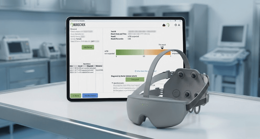 Nurochek™ is a portable, baseline-free EEG system that delivers objective brain function data in approximately two minutes using visual evoked potentials (VEPs), resulting in a precise EEG analyzed response triggered by light stimulus. Four hundred thousand data points are rapidly generated and analyzed via the supportive AI software resulting in a clear objective result. The Nurochek™ device is specifically engineered for healthcare environments where concussion decisions must be made swiftly and under intense time pressure, often with only limited objective data available.