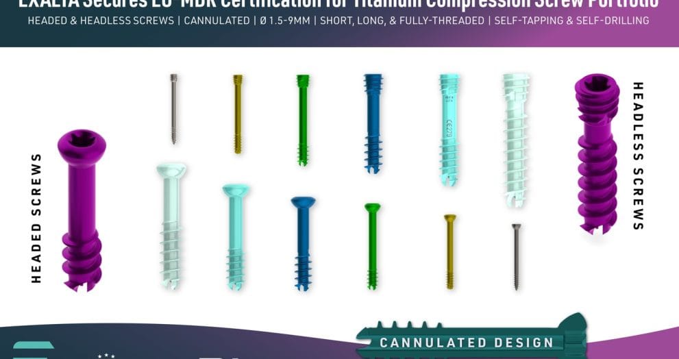 EXALTA Group, a global leader in the development and manufacturing of integrated OEM solutions for mission-critical medical devices, today announced it has obtained European Medical Device Regulation (EU-MDR) certification for its full range of headed and headless titanium compression screws used in trauma and reconstructive surgery.